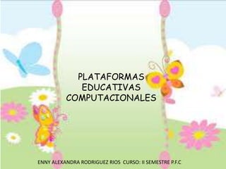 Este documento describe diferentes tipos de plataformas educativas computacionales. Define una plataforma educativa como una herramienta física o virtual que permite la interacción con fines pedagógicos. Luego describe varias plataformas populares como Moodle, Sakai, Dokeos, Claroline y Edmodo, las cuales facilitan el aprendizaje en línea y colaborativo en instituciones educativas.