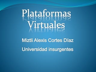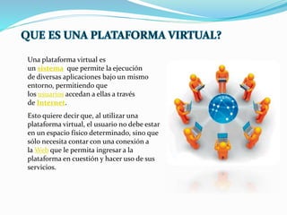 Una plataforma virtual permite el acceso a aplicaciones a través de Internet sin necesidad de estar en un espacio físico determinado, solo se requiere una conexión a la Web. Ofrece ventajas como la comunicación e interactividad entre usuarios, la formación personalizada según las necesidades e intereses de cada uno, y el acceso a la formación sin restricciones de tiempo o espacio. Sin embargo, también tiene desventajas como el mayor esfuerzo que requiere de los profesores para mantenerla actualizada y la necesidad de que los alumnos estén