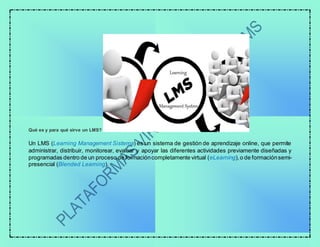 Este documento describe los sistemas de gestión del aprendizaje (LMS) y los sistemas de gestión del contenido del aprendizaje (LCMS). Explica que un LMS permite administrar, distribuir, monitorear y evaluar actividades de aprendizaje en línea o semipresenciales, mientras que un LCMS se enfoca en la creación y administración de contenidos educativos de manera dinámica a través de herramientas de autoría, publicación y colaboración. También destaca las ventajas de estos sistem