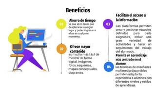 El documento aborda herramientas y plataformas de evaluación en tiempo real que ofrecen beneficios como ahorro de tiempo y acceso a información. Se destaca Popplet, una aplicación para crear mapas conceptuales, así como otras herramientas educativas como Trivinet, Formative y Flipquiz, que permiten interacción inmediata entre docentes y estudiantes. Estas herramientas facilitan un aprendizaje más centrado en el alumno y enriquecen la experiencia educativa con contenido multimedia.