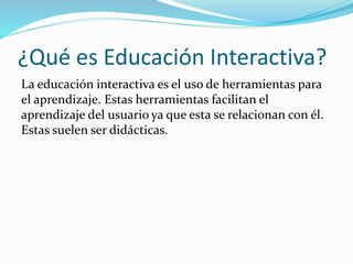 El documento trata sobre la educación interactiva y las plataformas virtuales de aprendizaje. Define la educación interactiva como el uso de herramientas didácticas que facilitan el aprendizaje relacionándose con el usuario. Explica que una plataforma virtual de aprendizaje es un sistema integral para gestionar, distribuir y dar seguimiento a contenidos educativos en un entorno colaborativo en línea. También describe diferentes tipos de aprendizaje virtual como e-learning, b-learning y m-learning.