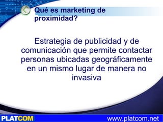 El marketing de proximidad utiliza tecnología Bluetooth para enviar contenido publicitario a dispositivos móviles cercanos sin necesidad de operadores celulares, permitiendo una comunicación no invasiva. Los usuarios deben aprobar la recepción de información, lo que garantiza que no se trata de spam. Esta estrategia es aplicable en diversos entornos, como eventos, centros comerciales y sitios turísticos, facilitando el acceso a ofertas, videos, y más.