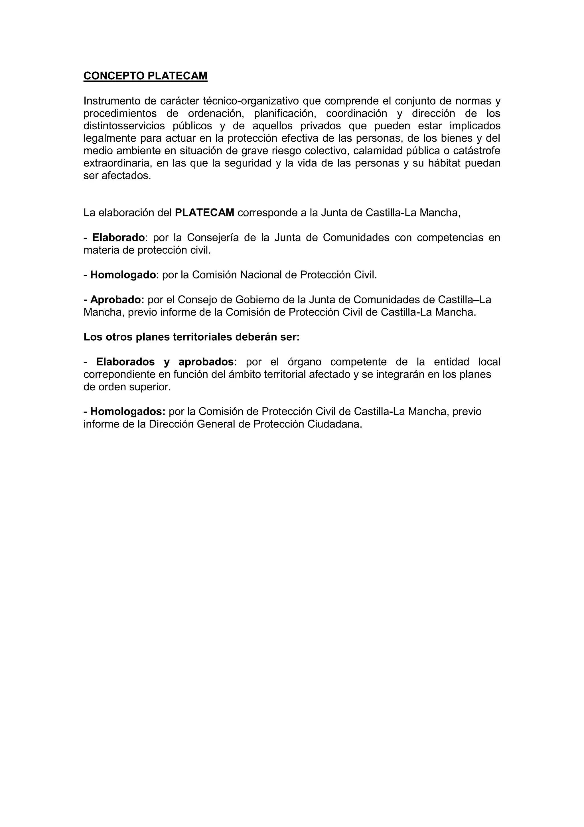 El PLATECAM es el plan de protección civil de Castilla-La Mancha que comprende normas y procedimientos para coordinar los servicios públicos y privados en situaciones de riesgo colectivo o catástrofe donde la seguridad de las personas pueda verse afectada. La Junta de Castilla-La Mancha es responsable de elaborar el PLATECAM, mientras que los planes territoriales más específicos son responsabilidad de las entidades locales y deben integrarse en los planes superiores.