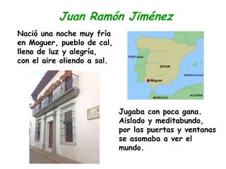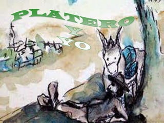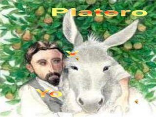 Este documento presenta varios poemas del escritor español Juan Ramón Jiménez que describen su relación con su burro Platero. Los poemas detallan cómo Platero acompaña a Juan Ramón en sus paseos diarios y cómo comparten una estrecha amistad. A través de Platero, Juan Ramón puede explorar la naturaleza y encontrar consuelo y alegría incluso en los momentos más difíciles.