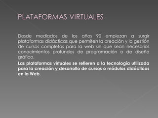 El documento describe las características y funcionalidades de varias plataformas virtuales de aprendizaje como Moodle, Dokeos, WebCT y Claroline. Moodle es un sistema de gestión de cursos de código abierto que promueve la pedagogía constructivista y ofrece diversas herramientas de comunicación y administración de cursos. Dokeos es también de código abierto y permite administrar contenidos educativos. WebCT es una plataforma comercial que facilita la creación de cursos interactivos online. Claroline es una plataforma abiert