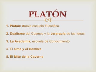Platón nació en Atenas en el seno de una familia aristocrática. Fue el principal alumno de Sócrates y se enfocó en el pensamiento, plasmando las enseñanzas de su maestro en los Diálogos tras su muerte. Platón propuso la existencia de un mundo sensible y otro inteligible, y consideró que lo real reside en el mundo de las ideas inmutables.