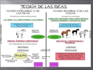 El documento describe la democracia ateniense y el surgimiento de los sofistas en la antigua Grecia. Los sofistas eran maestros itinerantes que enseñaban habilidades retóricas y argumentativas a cambio de dinero. Introdujeron el escepticismo y relativismo al cuestionar la existencia de una verdad absoluta. El documento también resume las ideas filosóficas de Platón, incluyendo su teoría de las Formas y el mito de la caverna.