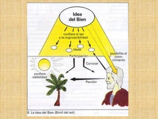 El documento aborda la teoría de las ideas de Platón, quien distingue entre la doxa (opiniones engañosas) y la episteme (conocimiento verdadero). Utiliza la alegoría de la caverna para ilustrar el viaje del alma hacia la realidad, donde el sol representa el bien y la verdad. La idea del bien es presentada como el objetivo máximo del conocimiento, fundamental para actuar con sabiduría en la vida privada y pública.