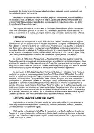 El documento resume las vidas y obras de Platón y Robert Capa. Ambos fueron exiliados políticos que utilizaron su trabajo para denunciar la injusticia y los absurdos de la guerra. Platón fundó la Academia en Atenas para enseñar sobre el bien y la justicia, mientras que las fotografías de guerra de Capa ayudaron a mostrar la realidad de la Guerra Civil Española.