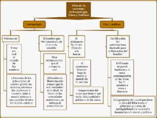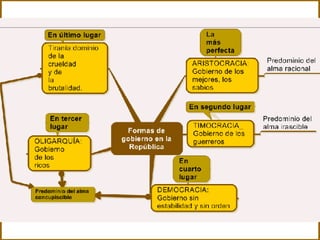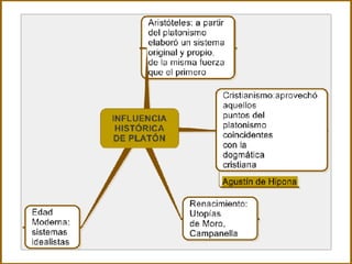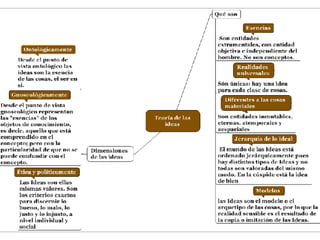 El documento resume la filosofía de Platón. Platón creía que el mundo material no es verdaderamente real, sino que lo real son las ideas inmutables. El alma humana es inmortal y preexistente, y el conocimiento es el recuerdo de las ideas. El filósofo debe guiar a los demás del mundo de sombras al mundo de las ideas a través de la dialéctica. En la República, Platón describe un estado ideal gobernado por filósofos donde la educación está controlada por el estado.