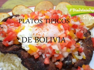 El documento presenta información sobre platos y bebidas típicos de Bolivia. Describe el refresco de cayú, una bebida hecha de manzana cayú, agua y azúcar. También describe el plato paceño, compuesto de choclo, habas, papas y queso, acompañado de llajwa. Otra bebida presentada es el singani sour, hecho de singani, gaseosa y limón. El documento también habla de bailes folclóricos bolivianos como la morenada, la diablada y