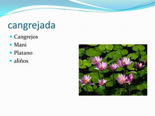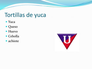 Este documento lista los ingredientes para cuatro platos típicos: tortillas de yuca (yuca, queso, huevo, cebolla, achiote), arroz con pollo (pollo, arveja, zanahoria, aliños), viste de carne (carne, aliños, papas) y sopa de pescado (pescado, verde, zanahoria, aliños).