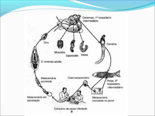 Este documento describe las características generales de los platelmintos. Son organismos multicelulares aplanados con simetría bilateral y tres capas germinales. Incluye las clases más importantes: Turbellaria (de vida libre), Trematoda y Cestoda (parásitos de vertebrados), y Monogenea (ectoparásitos de peces). Describe sus características anatómicas, ciclo de vida, reproducción y ejemplos representativos.