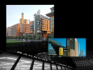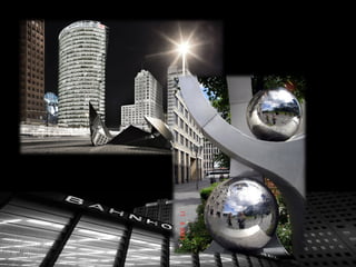 Este documento analiza los elementos del contexto en Potsdamer Platz, Berlín, Alemania. Describe las principales calles y sendas de la zona, como Potsdamer Strasse y Alte Potsdamer Strasse. Identifica el edificio Sony Center y la estación de tren en Potsdamer Strasse y Alte Potsdamer Strasse como nudos principales debido a su ubicación estratégica donde convergen las calles. Explica que los edificios Sony se han convertido en un punto de encuentro principal para las personas en la zona.