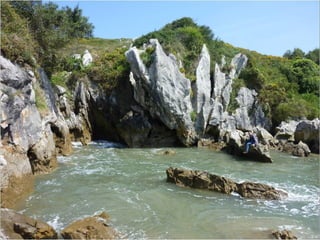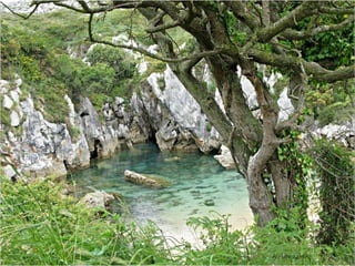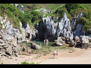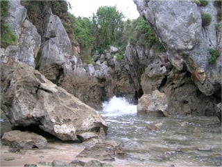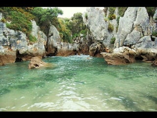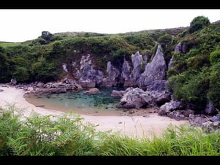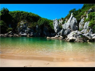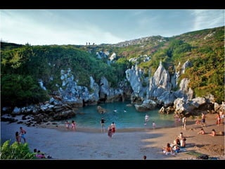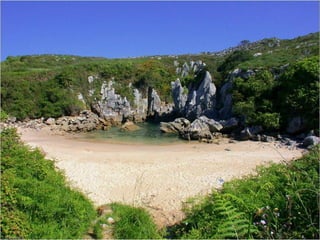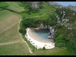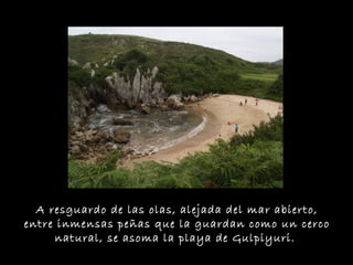 La playa de Gulpiyuri en Asturias es una pequeña cala protegida por grandes formaciones rocosas. Se encuentra a unos 100 metros tierra adentro y está unida al mar abierto por una caverna sometida a las mareas, lo que hace que a veces sea sólo un arenal y otras veces se convierta en una piscina natural cuando sube la marea. Declarada Monumento Natural, ofrece la curiosidad paisajística de una playa esculpida en la roca y alejada de las olas.