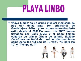 Playa Limbo es un grupo musical mexicano de pop con influencias de jazz formado en 2003 en Guadalajara. Sus integrantes son María León en voz y guitarra, Jorge Corrales en teclados, Ángel Baillo en bajo y Servando Yáñez en batería. En 2007 firmaron con Sony BMG y lanzaron su álbum debut "Canciones de Hotel" del cual se desprendieron sencillos exitosos. Desde entonces han lanzado más sencillos y álbumes demostrando su éxito en la industria musical mexicana.