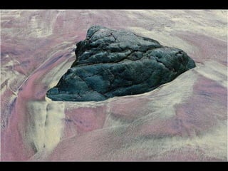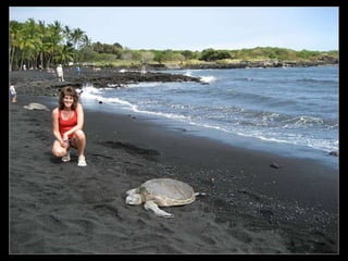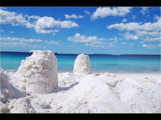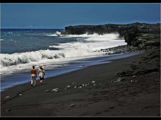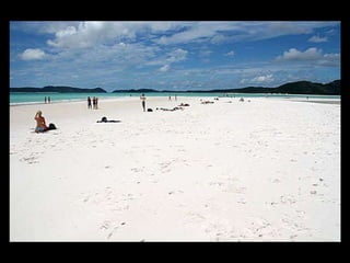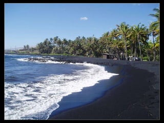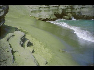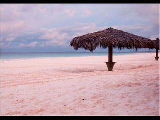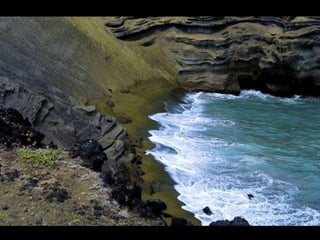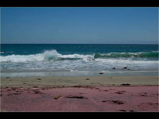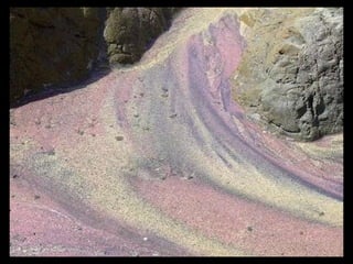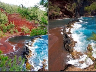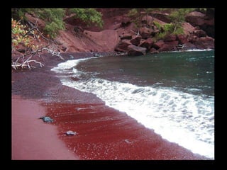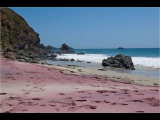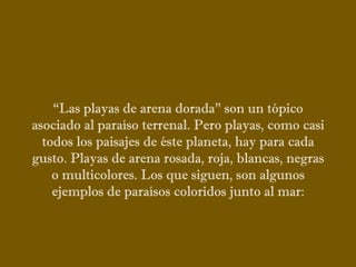 Este documento presenta varias playas de colores inusuales alrededor del mundo, incluyendo playas de arena rosada, roja, blanca, negra, verde y púrpura. Describe brevemente la ubicación y las causas geológicas del color de la arena en la Playa de Arena Rosada en Bahamas, la Playa Roja Kaihalulu en Hawaii, la Playa de Arena Blanca en Australia, la Playa Negra Punaluu en Hawaii, la Playa Verde Papakolea en Hawaii, y la Playa Púrpura Pfeiffer Beach en California