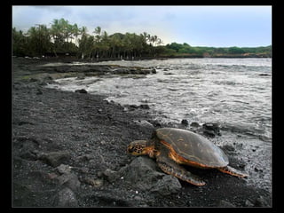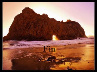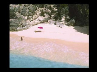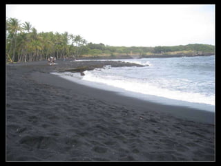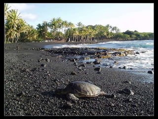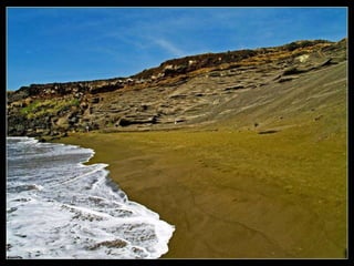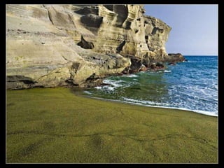 Este documento presenta varias playas de colores inusuales alrededor del mundo, incluyendo playas de arena rosada, roja, blanca, negra, verde y púrpura. Describe brevemente la ubicación y las causas geológicas del color de la arena en la Playa de Arena Rosada en Bahamas, la Playa Roja Kaihalulu en Hawaii, la Playa de Arena Blanca en Australia, la Playa Negra Punaluu en Hawaii, la Playa Verde Papakolea en Hawaii, y la Playa Púrpura Pfeiffer Beach en California