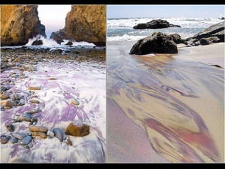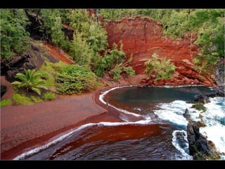 Este documento presenta varias playas de colores inusuales alrededor del mundo, incluyendo playas de arena rosada, roja, blanca, negra, verde y púrpura. Describe la Playa de Arena Rosada en Bahamas, la Playa Roja Kaihalulu en Hawaii cuya arena roja se debe a la erosión de arenisca rojiza, y la playa blanca casi pura de cuarzo llamada Hyams Beach en Australia. También menciona playas de arena negra en Hawaii formadas por basalto volcánico, una playa verde en Pap