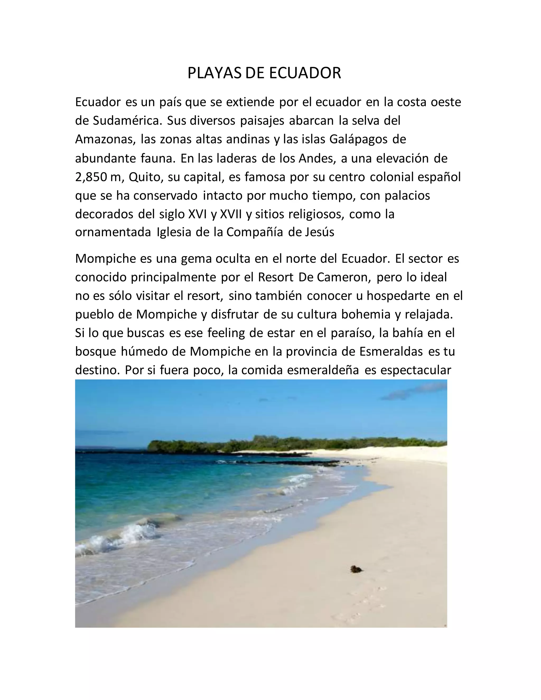 Ecuador es un país con diversos paisajes que incluyen la selva amazónica, los Andes y las islas Galápagos. Su capital Quito, ubicada a 2,850 metros sobre el nivel del mar en las laderas de los Andes, es famosa por su centro colonial español bien conservado con palacios y sitios religiosos del siglo XVI y XVII. Mompiche, un pueblo oculto en el norte de Ecuador, ofrece playas vírgenes y una cultura bohemia y relajada, además de una espectacular cocina