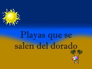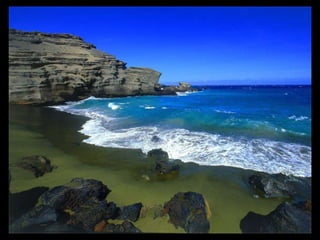 Este documento presenta varias playas de colores inusuales alrededor del mundo, incluyendo playas de arena rosada, roja, blanca, negra, verde y púrpura. Describe brevemente la ubicación y las causas geológicas del color de la arena en la Playa de Arena Rosada en Bahamas, la Playa Roja Kaihalulu en Hawaii, la Playa de Arena Blanca en Australia, la Playa Negra Punaluu en Hawaii, la Playa Verde Papakolea en Hawaii, y la Playa Púrpura Pfeiffer Beach en California