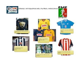 Este documento presenta una lista de playeras de equipos de fútbol mexicanos e internacionales, así como estadios y consolas de videojuegos en venta. Incluye imágenes, códigos, nombres, descripciones y precios de distintos productos relacionados con el fútbol como playeras de equipos como América, Pumas, Cruz Azul; estadios como el Azteca, Jalisco y Old Trafford; y consolas como Wii, Xbox y PlayStation.