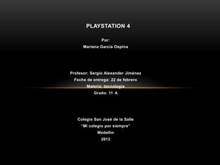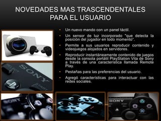 El documento describe las novedades más trascendentales de la PlayStation 4, incluyendo un nuevo mando táctil, un sensor de luz para detectar la posición del jugador, la capacidad de reproducir contenido alojado en servidores y de forma remota desde la PlayStation Vita. También habla de la opinión personal de la autora sobre cómo la tecnología y las empresas de videojuegos buscan innovar para captar la atención de diferentes usuarios y superar la sedentariedad que se le critica a los videojuegos.