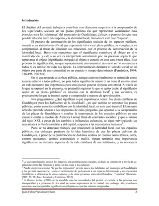 El documento analiza la posible relación entre los significados sociales de las plazas públicas en Guadalajara y la identidad local llamada "tapatía". A través de una encuesta, investiga la importancia de las plazas públicas en su relación con la identidad tapatía. Busca descubrir nuevos elementos implícitos en esta relación y cómo los espacios públicos podrían influir en la construcción de la identidad local de los habitantes.