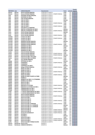 El documento proporciona información sobre los puestos de trabajo de atención al cliente y reparto en diferentes oficinas y unidades de distribución en varias provincias españolas. Se especifica la provincia, unidad, denominación del puesto, turno de trabajo y jornada para cada puesto.