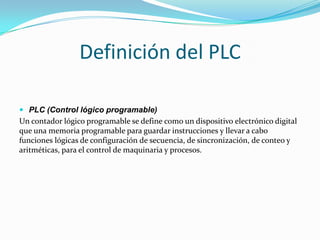 Este documento define el PLC como un dispositivo electrónico digital con memoria programable que lleva a cabo funciones lógicas y de control de secuencia para el control de maquinaria y procesos. Explica que los PLC permiten modificar sistemas de control sin volver a alambrar, y enumera algunas de sus partes y ventajas como aumentar la calidad y control de producción y reducir incidencias laborales.