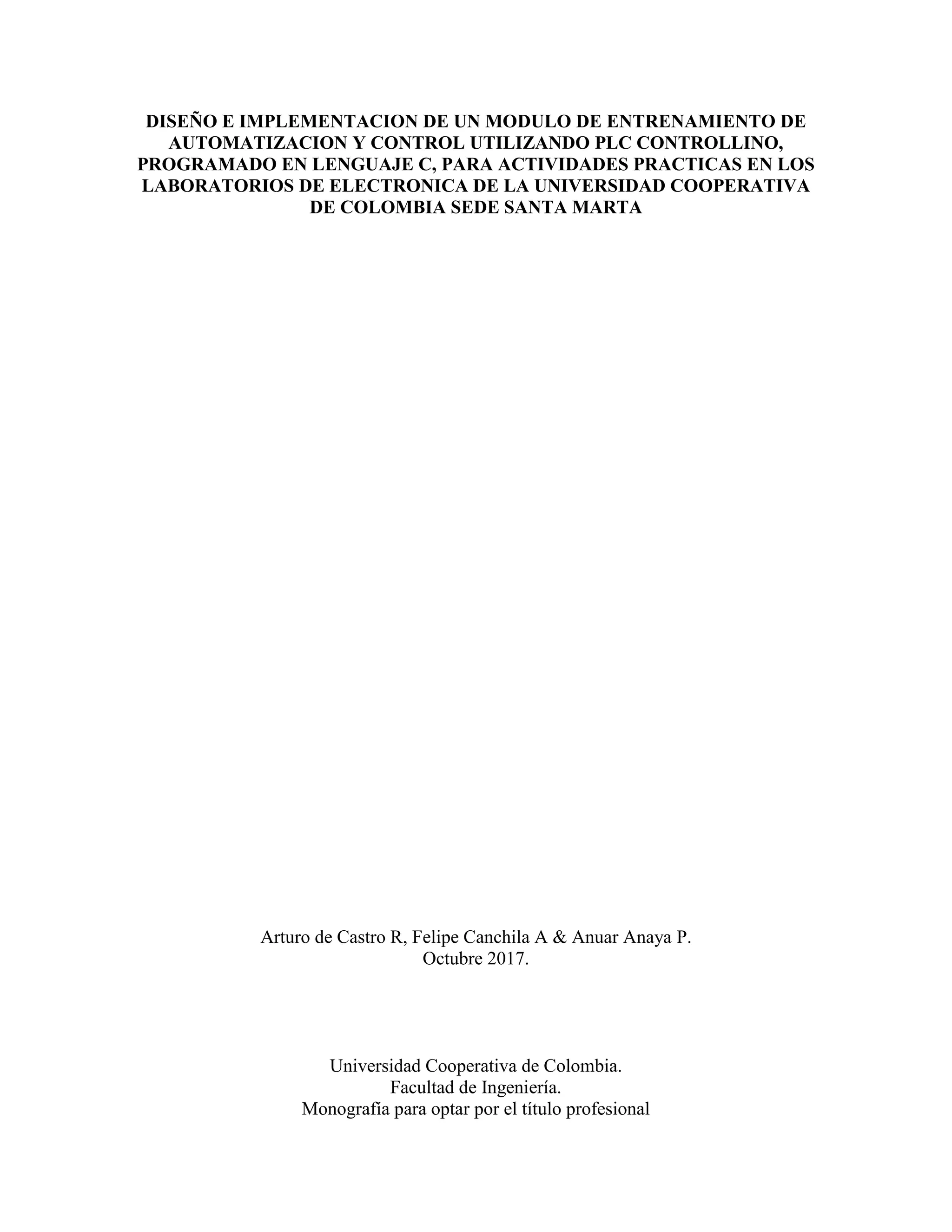 Este documento describe el diseño e implementación de un módulo de entrenamiento de automatización y control utilizando un PLC Controllino programado en lenguaje C. El módulo se desarrolló para ser utilizado en los laboratorios de electrónica de la Universidad Cooperativa de Colombia sede Santa Marta. El documento incluye la definición y funcionamiento del PLC Controllino, el diseño del módulo a través de SketchUp, la elaboración de un manual de instrucciones y diferentes ejemplos de código para su operación.