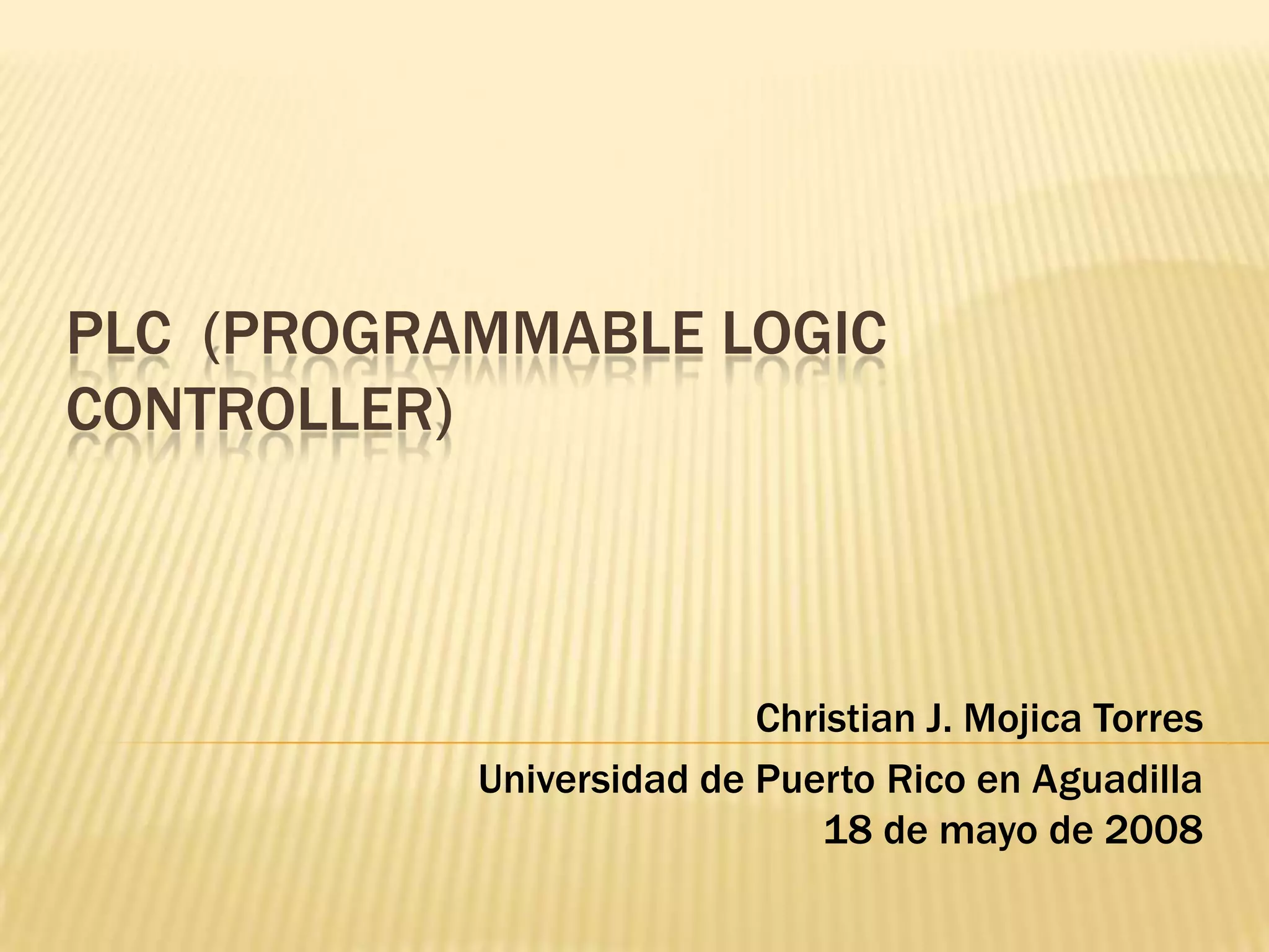 El documento proporciona una introducción al controlador lógico programable (PLC). Explica que los PLC se desarrollaron a finales de 1960 para reemplazar sistemas de control eléctricos basados en relés. Detalla las estructuras básicas de un PLC, incluyendo la fuente de alimentación, la unidad central de procesamiento, los módulos de entrada y salida, y la terminal de programación. También enumera algunas ventajas clave de los PLC como su capacidad para controlar sistemas complejos de manera flexible y
