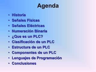 El documento trata sobre los controladores lógicos programables (PLC). Explica brevemente la historia de los PLC, cómo convierten las señales físicas en señales eléctricas, la numeración binaria, la definición de un PLC, su clasificación y componentes principales como la unidad central de proceso y la memoria. También describe el ciclo de funcionamiento de un PLC y los lenguajes de programación más comunes.