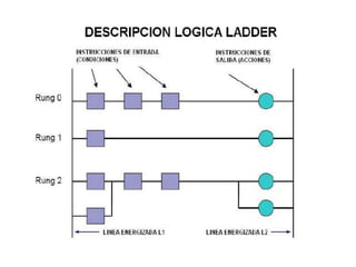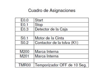 El resumen describe los pasos básicos de la programación ladder para controlar el movimiento de cajas en una cinta transportadora: 1) Cuando un sensor detecta una caja, detiene el motor de la cinta; 2) Abre un contactor para llenar la caja durante 10 segundos usando un relé interno; 3) Después de 10 segundos, cierra el contactor y reanuda el movimiento de la cinta. Este proceso se repite cada vez que se detecta una nueva caja.
