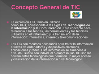Las Tecnologías de la Información y la Comunicación (TIC) hacen referencia a las teorías, herramientas y técnicas utilizadas para procesar y transmitir información, incluyendo computadoras, internet y telecomunicaciones. La Web 1.0 consistió principalmente en navegación de texto, mientras que la Web 2.0 fomentó la participación activa. La Web 3.0 se basa en la estructuración semántica de la información para encontrarla de manera más rápida. Un Entorno Personal de Aprendizaje (