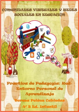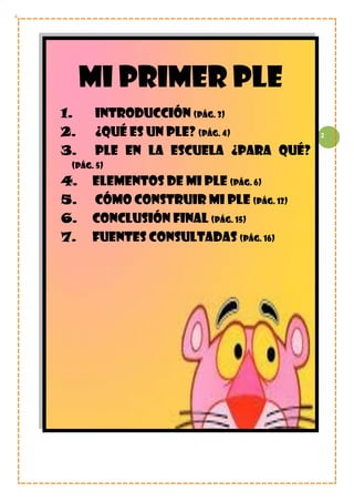 El documento describe los elementos clave de un Entorno Personal de Aprendizaje (PLE). Explica que un PLE contiene herramientas de búsqueda de información, filtrado y contraste de información, comunicación y compartir información, y herramientas de creación. Luego procede a enumerar ejemplos concretos de sitios web, redes sociales, servicios de almacenamiento en la nube y otras herramientas que la autora utiliza como parte de su propio PLE.