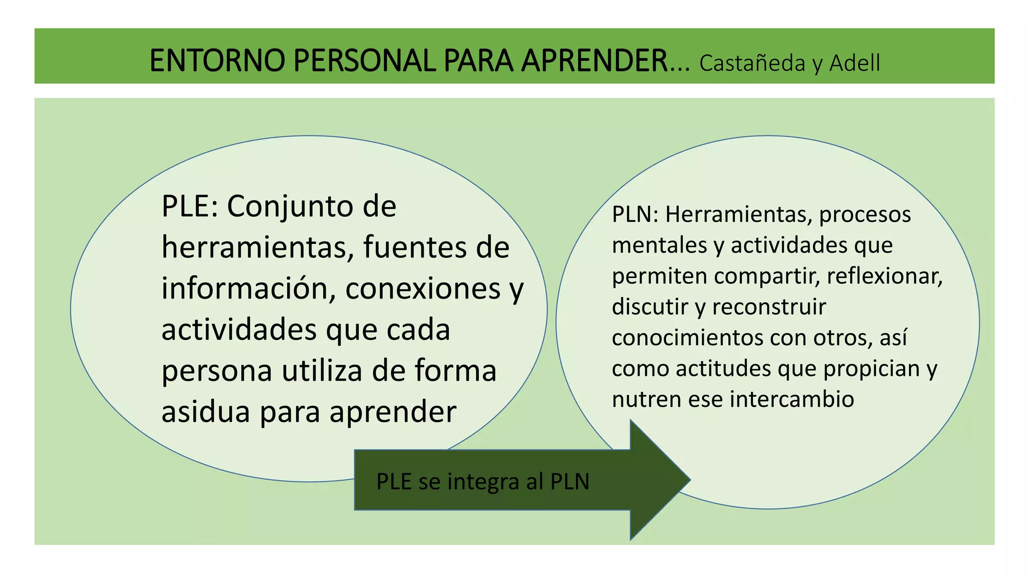 Este documento describe el concepto de Entorno Personal para Aprender (PLE) y Red Personal de Aprendizaje (PLN). Explica que el PLE incluye las herramientas, fuentes de información y actividades que una persona usa para aprender de forma habitual, mientras que el PLN permite compartir, reflexionar y reconstruir conocimientos con otros. El documento también analiza cómo estos conceptos se relacionan con teorías del aprendizaje sociocultural y cómo el acceso a la información en Internet ha ampliado las posibilidades del PLE y su impact