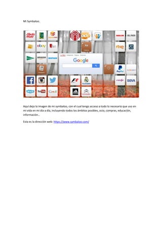 Este documento presenta el symbaloo de una persona, que es una página web personalizada que contiene enlaces a recursos y sitios web relacionados con todos los aspectos de su vida diaria como ocio, compras, educación e información. Se incluye un enlace a la dirección web del symbaloo.