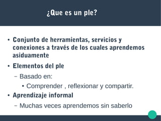 Un PLE (Personal Learning Environment) es un conjunto de herramientas, servicios y conexiones a través de los cuales aprendemos continuamente de manera informal. Un PLN (Personal Learning Network) es un subconjunto de un PLE y consiste en una red personal de aprendizaje a través de la cual elegimos aprender comprendiendo, reflexionando y compartiendo información. Algunas herramientas comunes de un PLN incluyen blogs, foros y redes sociales.