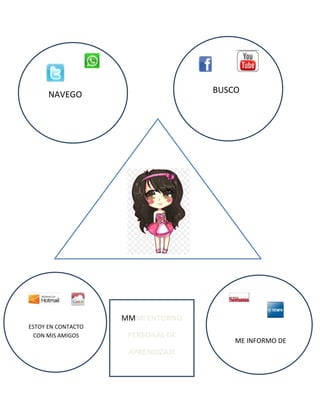 El documento habla sobre las actividades de aprendizaje y comunicación de una persona en su entorno personal. La persona navega por internet para buscar información, se mantiene en contacto con amigos y se informa sobre temas de interés.