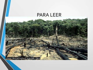 El documento habla sobre los efectos nocivos de la deforestación, en particular la técnica de tala y quema utilizada para despejar grandes áreas. Esto libera grandes cantidades de dióxido de carbono y contribuye al cambio climático. Además, destruye hábitats y acelera la erosión, lo que aumenta las inundaciones estacionales. El documento también incluye actividades como una sopa de letras y preguntas para evaluar y compartir información sobre la deforestación.