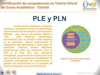 Este documento describe los conceptos de PLE (Entornos Personales de Aprendizaje) y PLN (Redes Personales de Aprendizaje). El PLE se refiere al uso de tecnologías para gestionar el aprendizaje permanente centrado en el aprendiz, mientras que el PLN se refiere a la red de personas con la que un individuo interactúa con fines de aprendizaje. El documento explica cómo construir un PLE y las etapas para desarrollar un PLN efectivo.