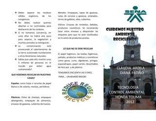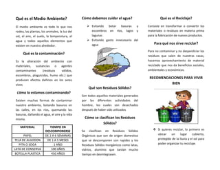 El documento habla sobre el medio ambiente, la contaminación, el reciclaje y cómo cuidar los recursos naturales. Explica que el medio ambiente son todos los elementos que nos rodean y que la contaminación es la alteración del ambiente con materiales dañinos. También describe el proceso de reciclaje y recomienda separar y reciclar materiales como papel, plástico y metales para reducir la contaminación y aprovechar los recursos.