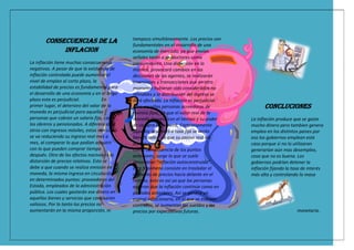 La inflación es el aumento general y continuado de los precios causado por factores como el crecimiento del dinero en circulación o los costos de producción. Existen tres tipos de inflación: de demanda, de costos y autoconstruida. Los bancos centrales pueden controlar la inflación subiendo las tasas de interés y controlando la oferta monetaria. Sin embargo, esto puede reducir el crecimiento económico y aumentar el desempleo. La inflación tiene consecuencias negativas como deteriorar el poder adquisitivo de los salarios fijos y distorsion