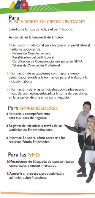 Este documento proporciona información sobre los servicios de empleo, emprendimiento y fortalecimiento de PyMEs ofrecidos por el Servicio Nacional de Empleo SENA. El SNE busca facilitar la intermediación laboral entre buscadores de empleo y empresas, ofreciendo orientación profesional, formación complementaria, y apoyo a emprendedores e iniciativas de negocio. Adicionalmente, provee información sobre ocupaciones emergentes y de mayor demanda a través de su Observatorio Laboral.