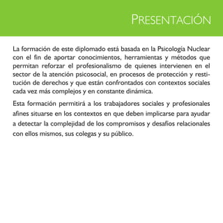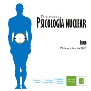Este documento describe un diplomado en Psicología Nuclear que se llevará a cabo entre octubre de 2012 y mayo de 2013. La formación estará a cargo de la Dra. Annie Winkel y constará de 120 horas divididas en 4 módulos. El diplomado abordará conceptos como los ciclos de conciencia, la espiral de la vida y la cronología fundamental, con el fin de fortalecer las habilidades de los profesionales que trabajan en el sector de atención psicosocial.