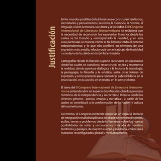 Este documento presenta la programación del II Congreso Internacional de Literatura Iberoamericana que se llevará a cabo del 22 al 25 de septiembre de 2010 en Bogotá, Colombia. El congreso explorará temas como la literatura y la independencia, la memoria histórica, la teoría crítica literaria y más a través de ponencias, seminarios y actividades culturales. El evento busca reconstruir los escenarios literarios que han dado forma a la realidad latinoamericana y celebrar el bicentenario de la independencia de Colombia a través