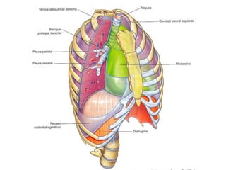 La pleura es una membrana serosa que recubre los pulmones, el mediastino, el diafragma y la parte interna de la caja torácica. Está compuesta de la pleura parietal, que está en contacto con la caja torácica, y la pleura visceral, que está en contacto con los pulmones. Entre ambas pleuras existe un espacio virtual llamado cavidad pleural que contiene una capa de líquido casi capilar.