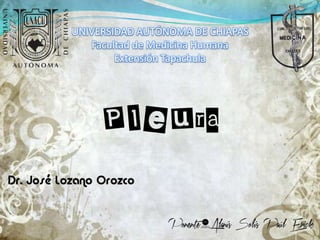 El documento describe la anatomía de la pleura, incluyendo que consta de dos hojas (pleura visceral y pleura parietal) que envuelven los pulmones y forman la cavidad pleural. Describe las características de cada hoja pleural, los recesos pleurales y otros detalles anatomía como la vascularización e inervación de la pleura.