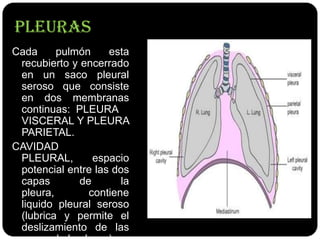 Los pulmones están recubiertos por una membrana serosa llamada pleura, que presenta dos capas: visceral y parietal, y un espacio entre ellas lleno de líquido pleural. Existen distintos tipos de pleura que recubren las cavidades pulmonares, y lesiones en estas áreas pueden producir condiciones como neumotórax o hemotórax. La orientación clínica incluye procedimientos como toracocentesis y toracoscopia para diagnosticar y tratar patologías torácicas.